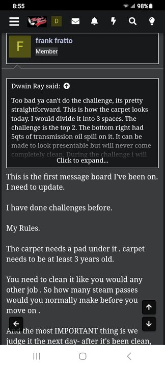 I still don't understand what you mean "my rules" i simply said choose a side and clean it. you came up with all the rules had to be this ,had to do that etc. I just said out clean me on this carpet and take home the silver. You yourself came up with all sorts of rules and conditions. All i said was choose a side and clean it and ill clean the other cleanest side wins.