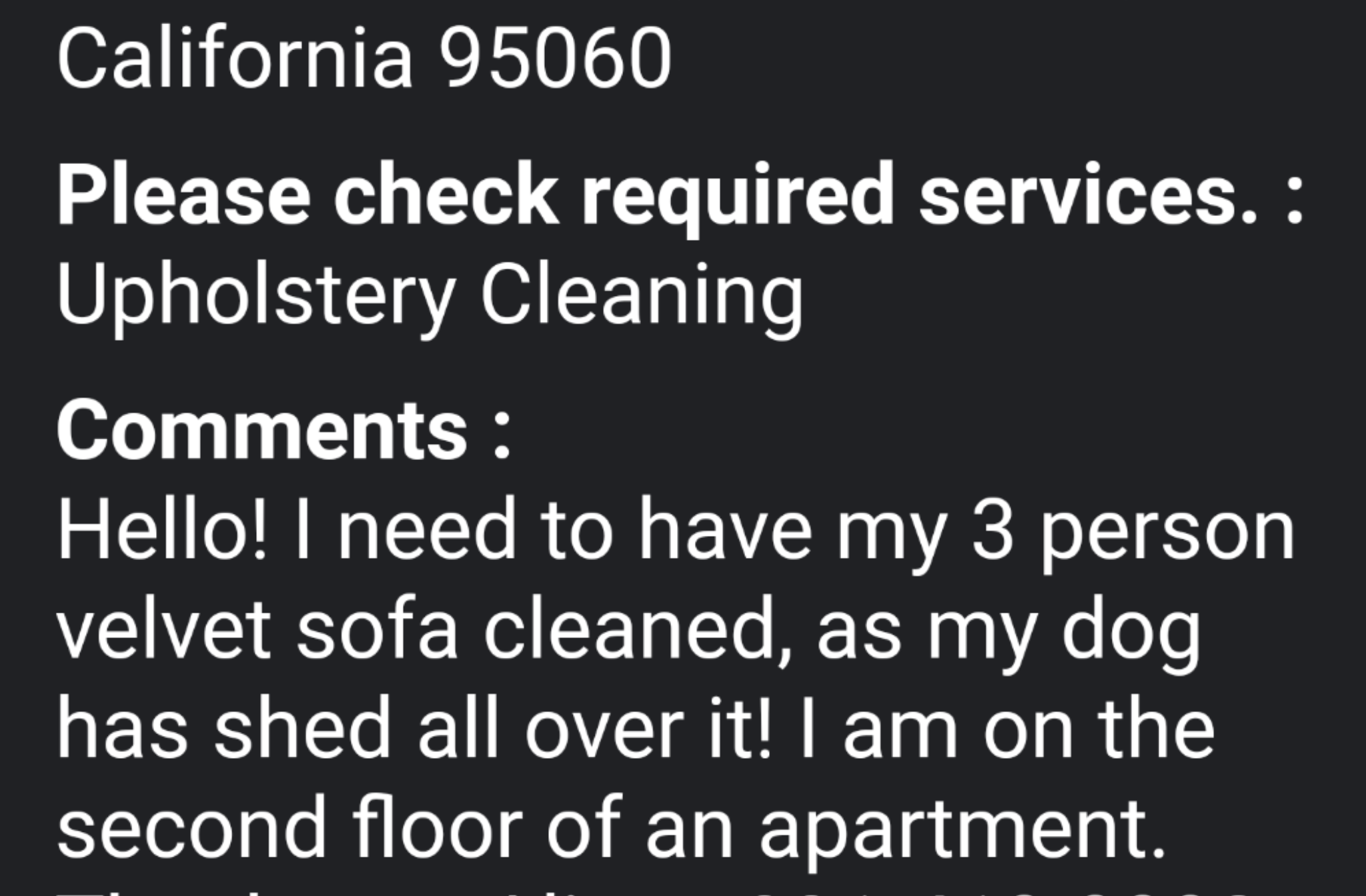 Or, 2 days prior, ‘I’ve got 3 large dogs that continually pee in my living room, hallway, and bedroom, I rented a rug doctor, but after multiple tries, I can’t seem to get the smell out, it actually smells worse.... do you guys have a special going on that includes deodorizer’????