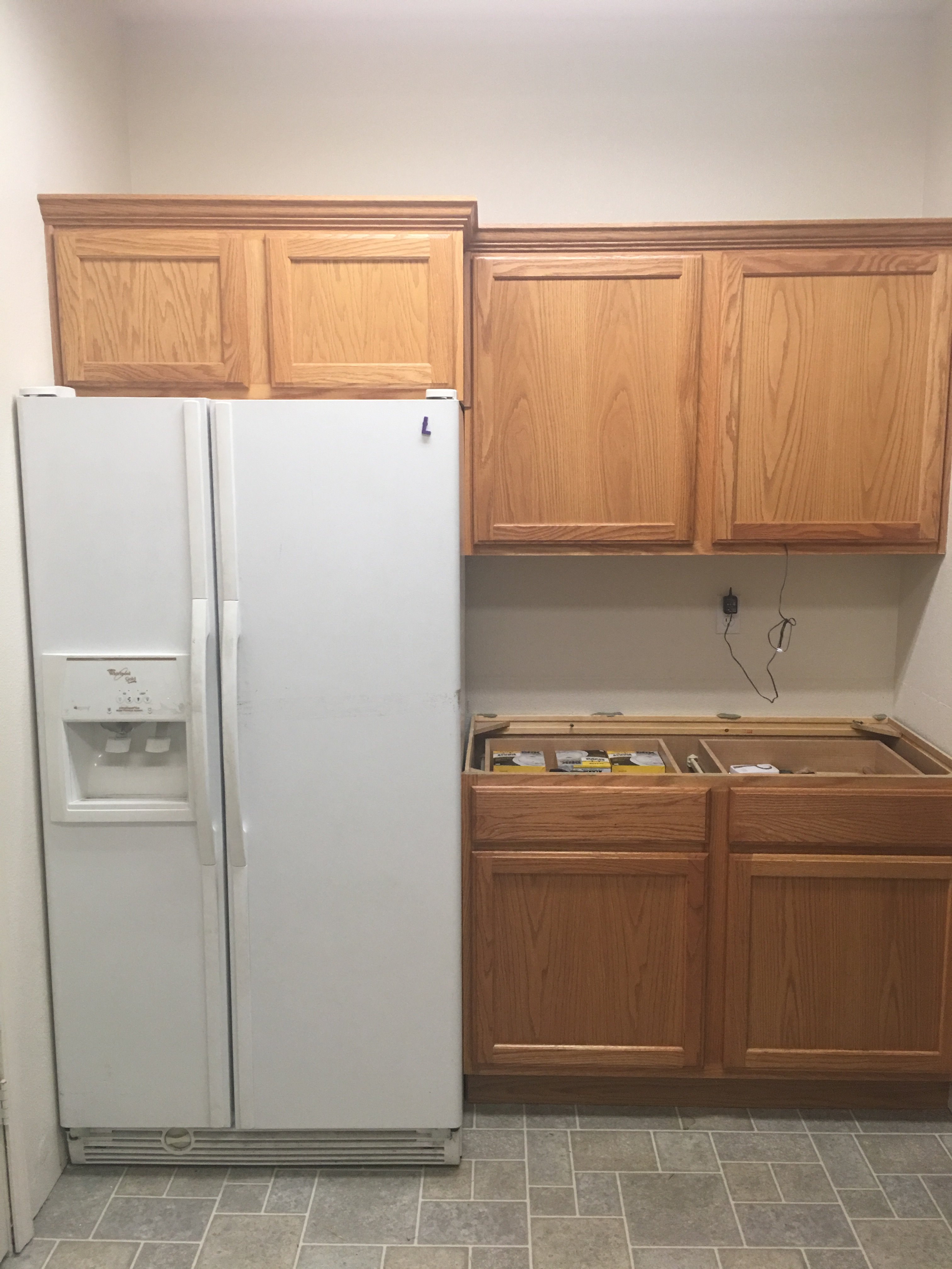 I had to pull off the bathroom door, door trim, hinges, and floor trim to get it to fit. Also had to pull off the counter top. I'll need to cut the counter top down 1/4” on my table saw. At least I got it in and working. Now to stock it with Macy’s favorite drinks. She likes the Propel flavored waters.