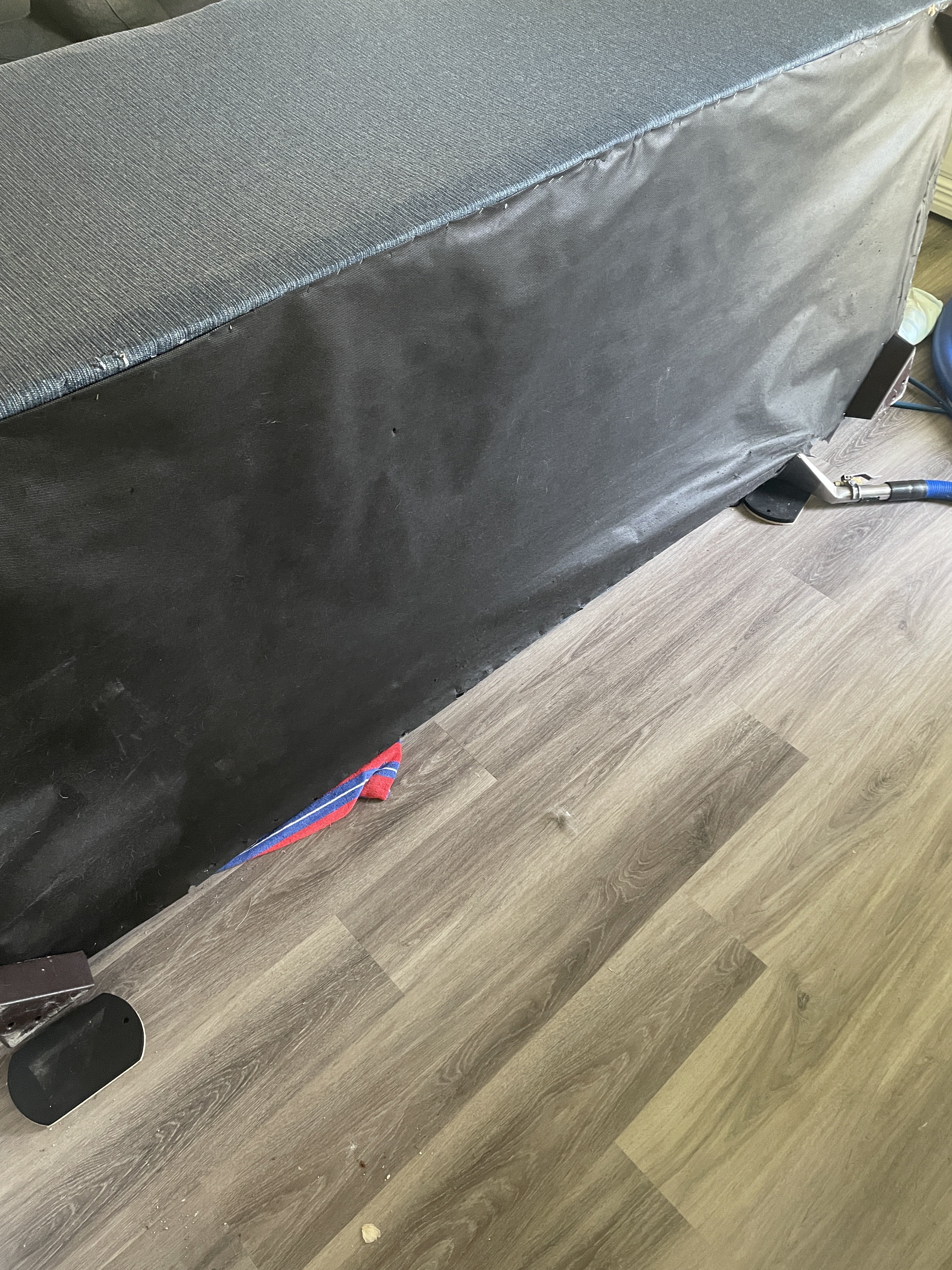 He thought he had a good hiding place when the strange man came in.First job, sectional. Was 30 minutes into cleaning the 2 pieces with all the cushions off. I flipped the one, did my vac and cleaned. Next flipped the other piece. Vacuumed pretty hard, a lot of hair.