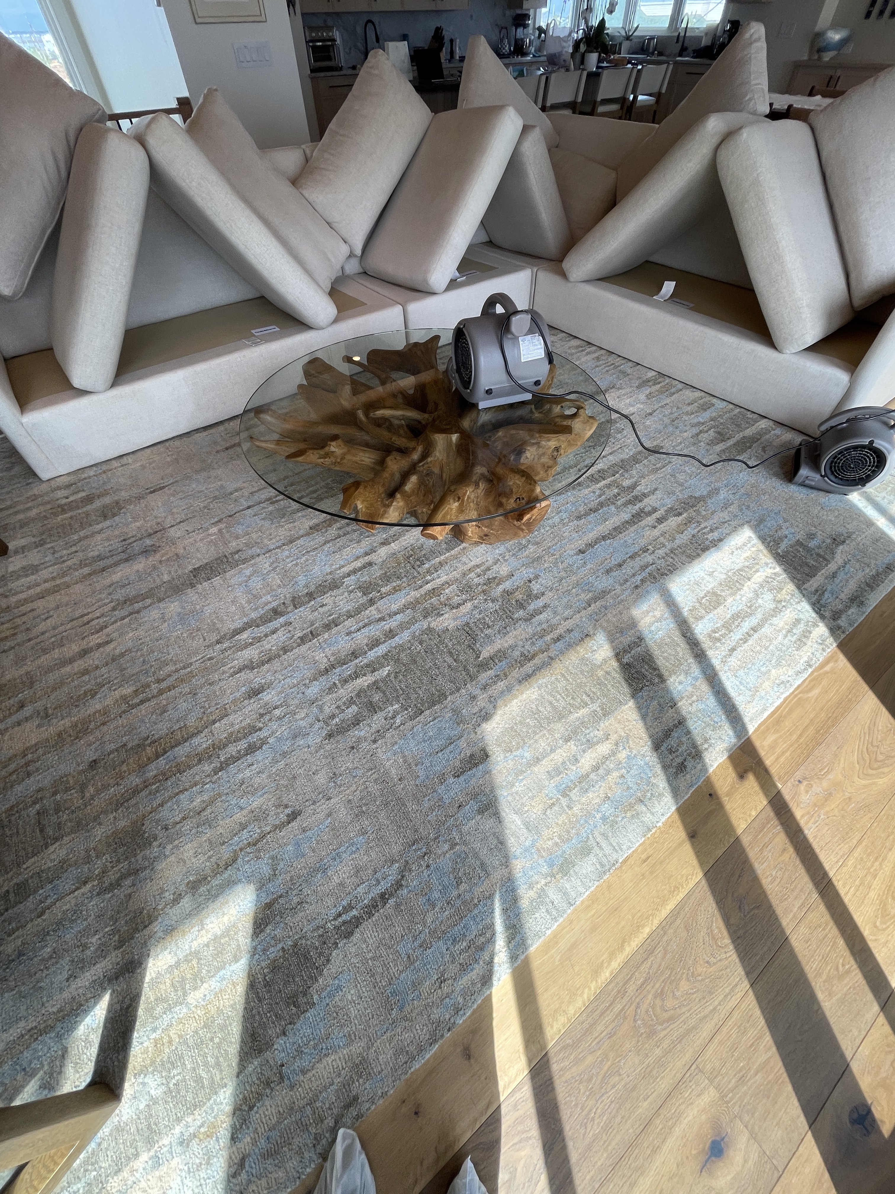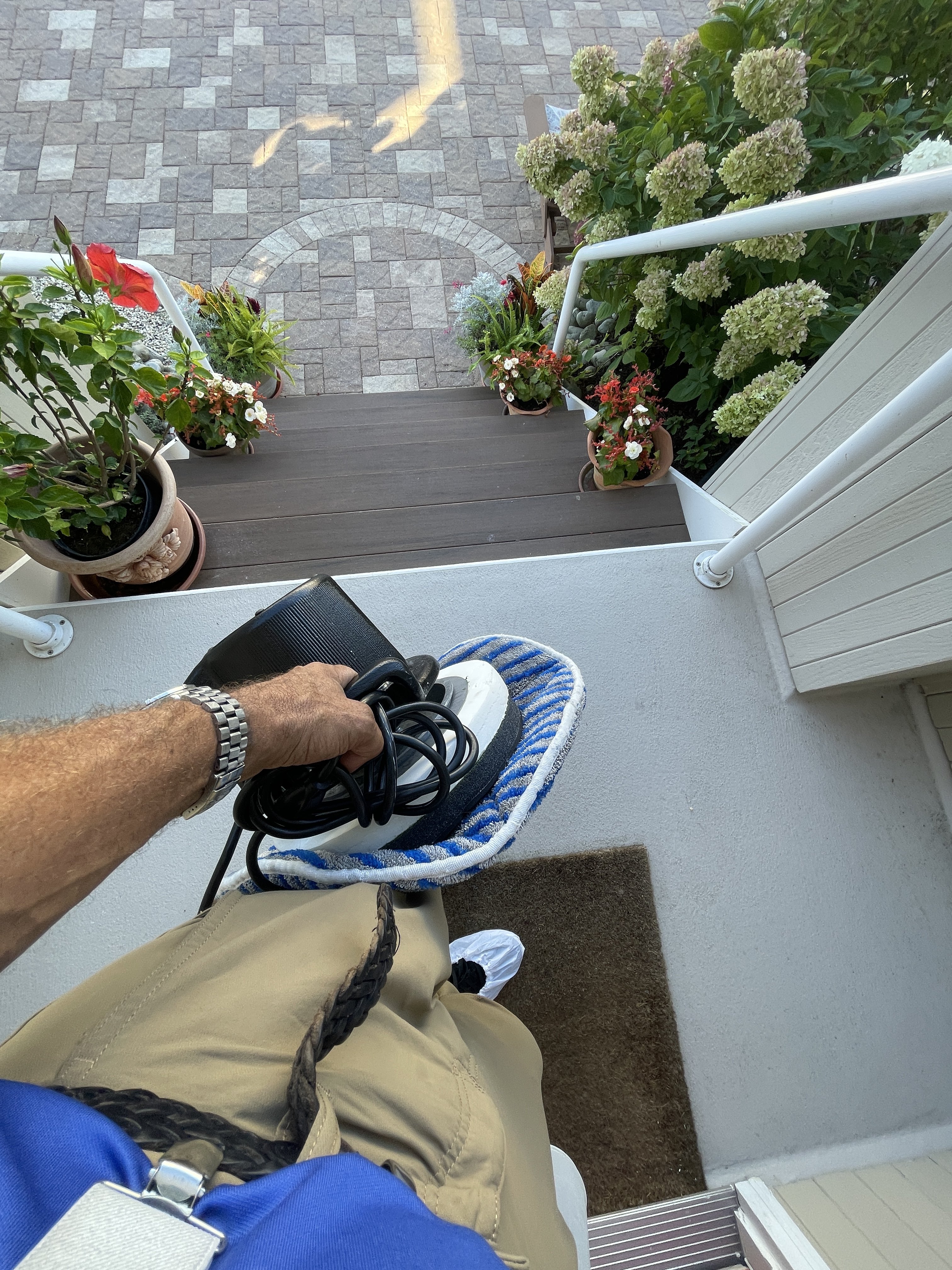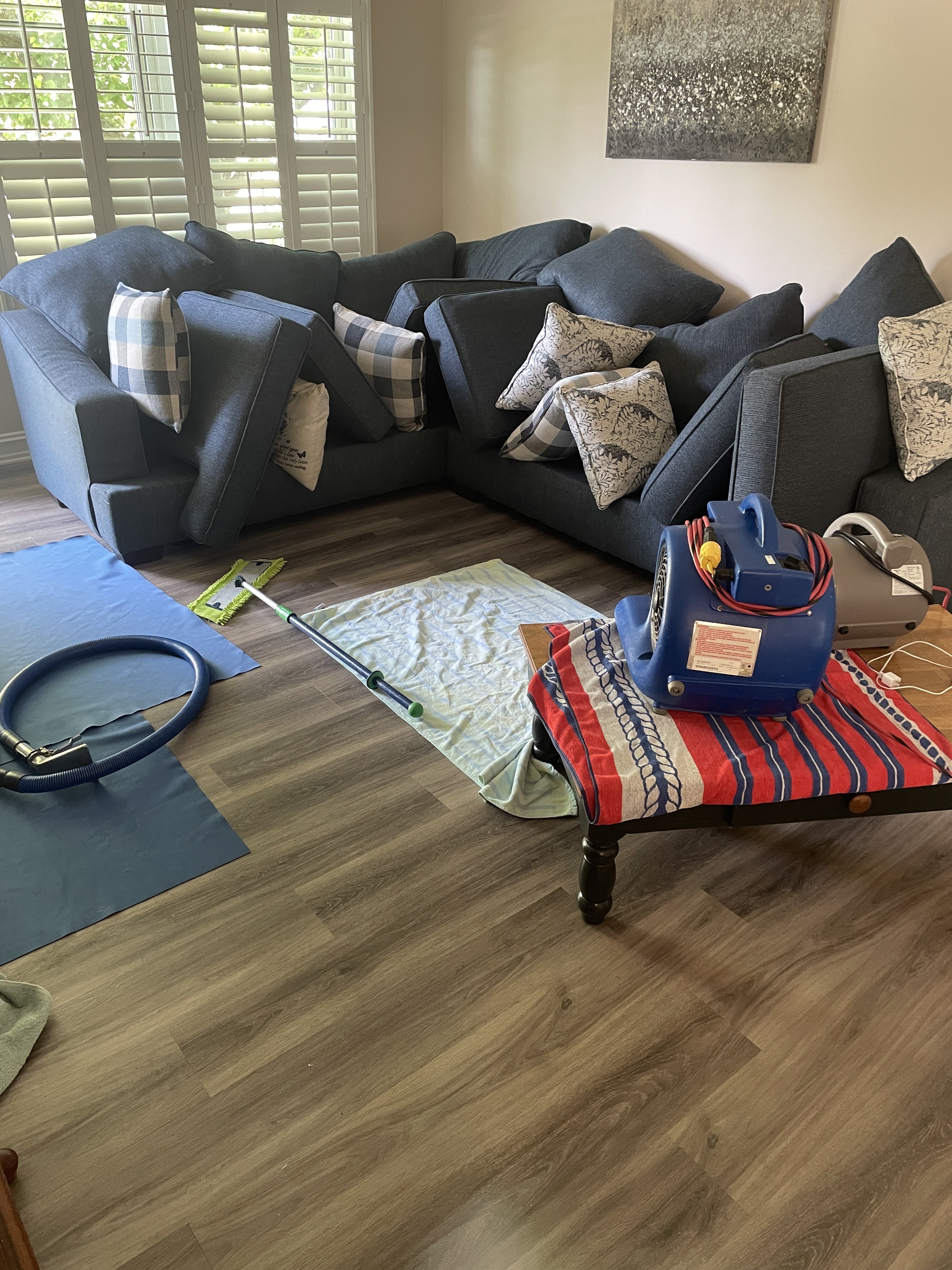 So.... In my defense, I have this entire house for a wall to wall carpet cleaning scheduled in October. This is a 5 year customer with 8 jobs completed, not including this one. It was an emergency pet spot job, all the way up at the top. I peeled off 100 feet of vac hose in one shot and worked it down. Took care of the spot that was worked on hard by the customer. I nailed it. Microban, PMF 1530 and some deodorizer, etc. Charged $60. Get the call today it wicked back. No problem, after 5oclock, I went back and padded it clean, and dry. Give me the ticket.lol….but not whatever you feel is “ok” like tying hoses to a table with a vase in a stairwell or putting fans on a glass table.
