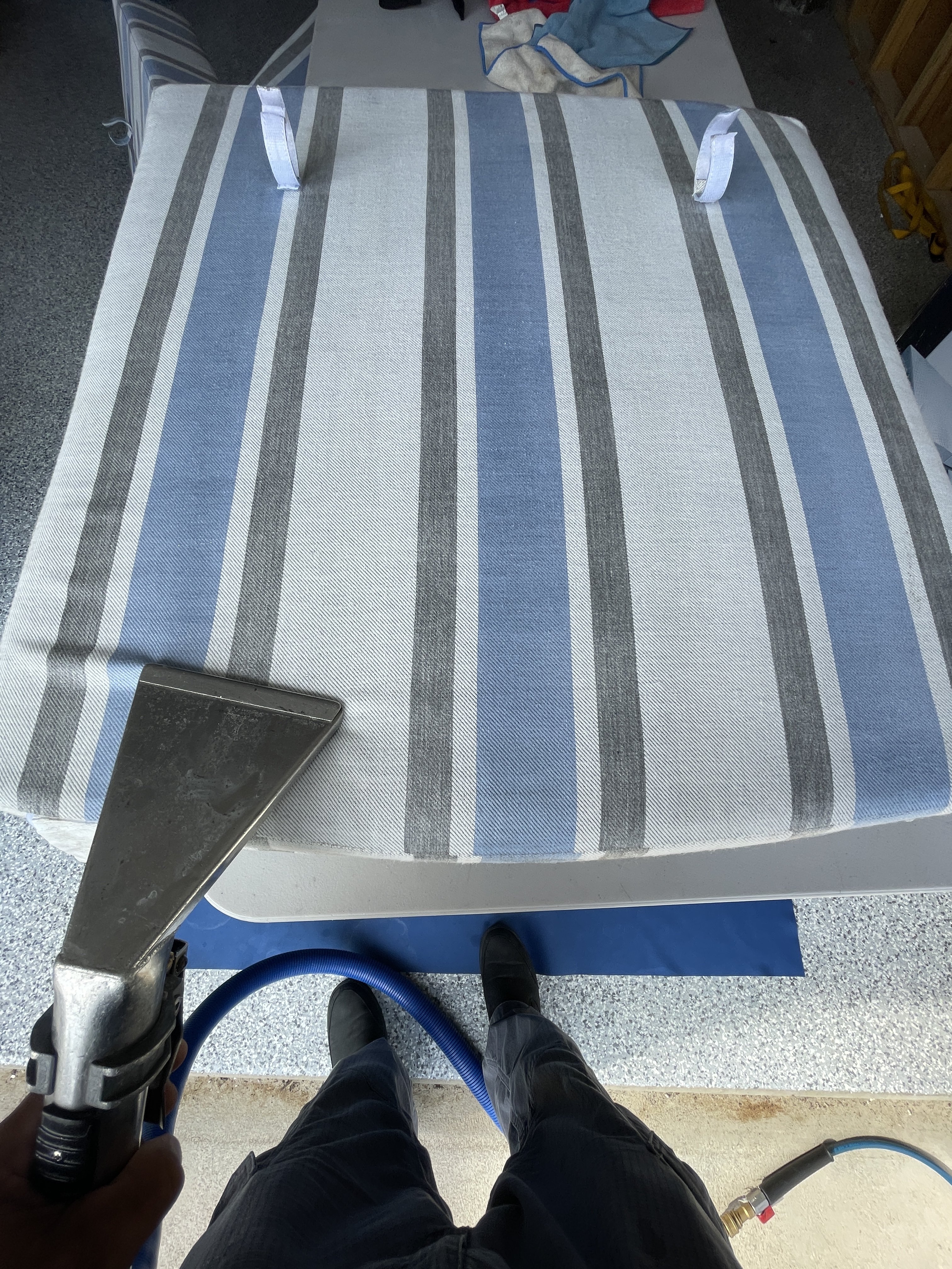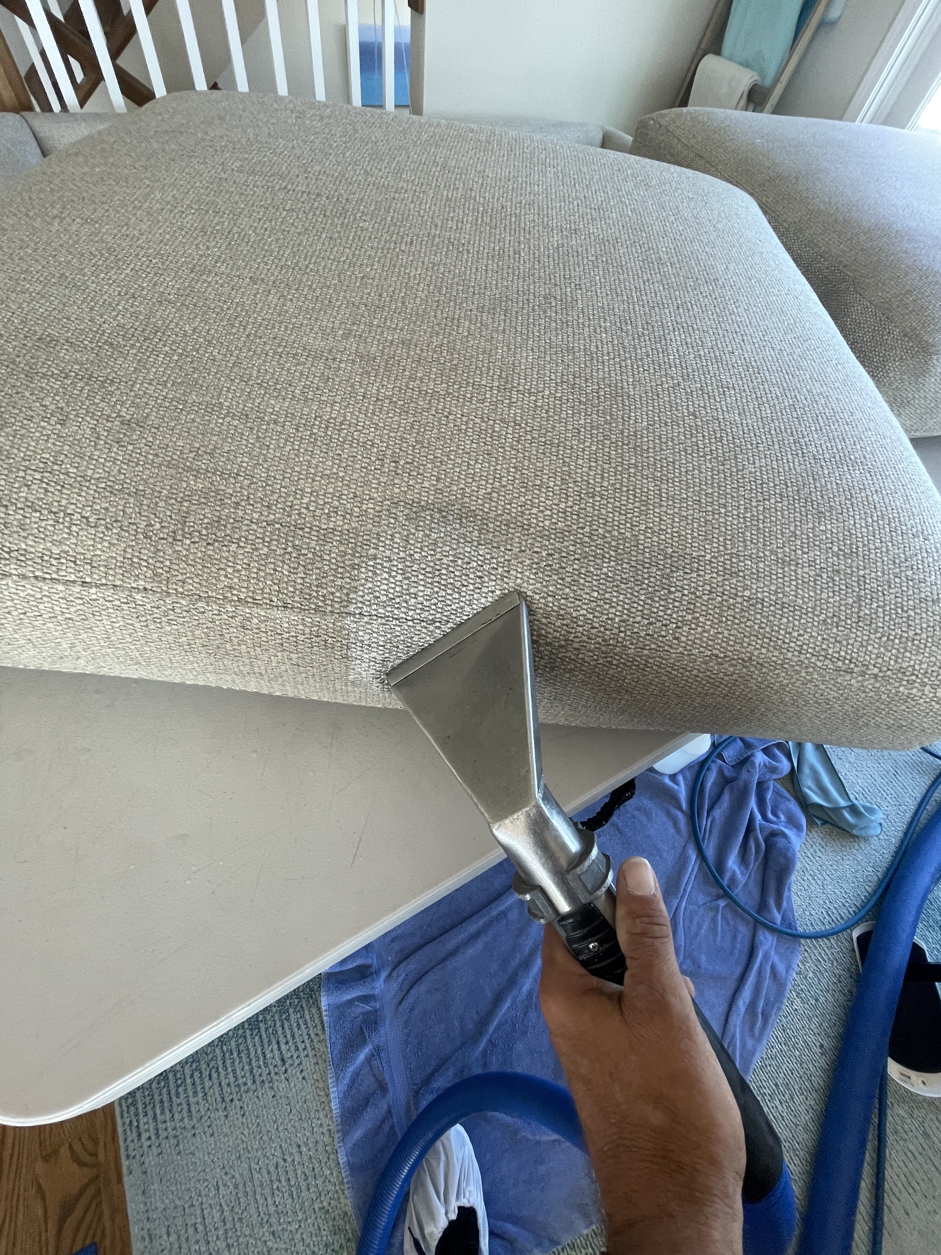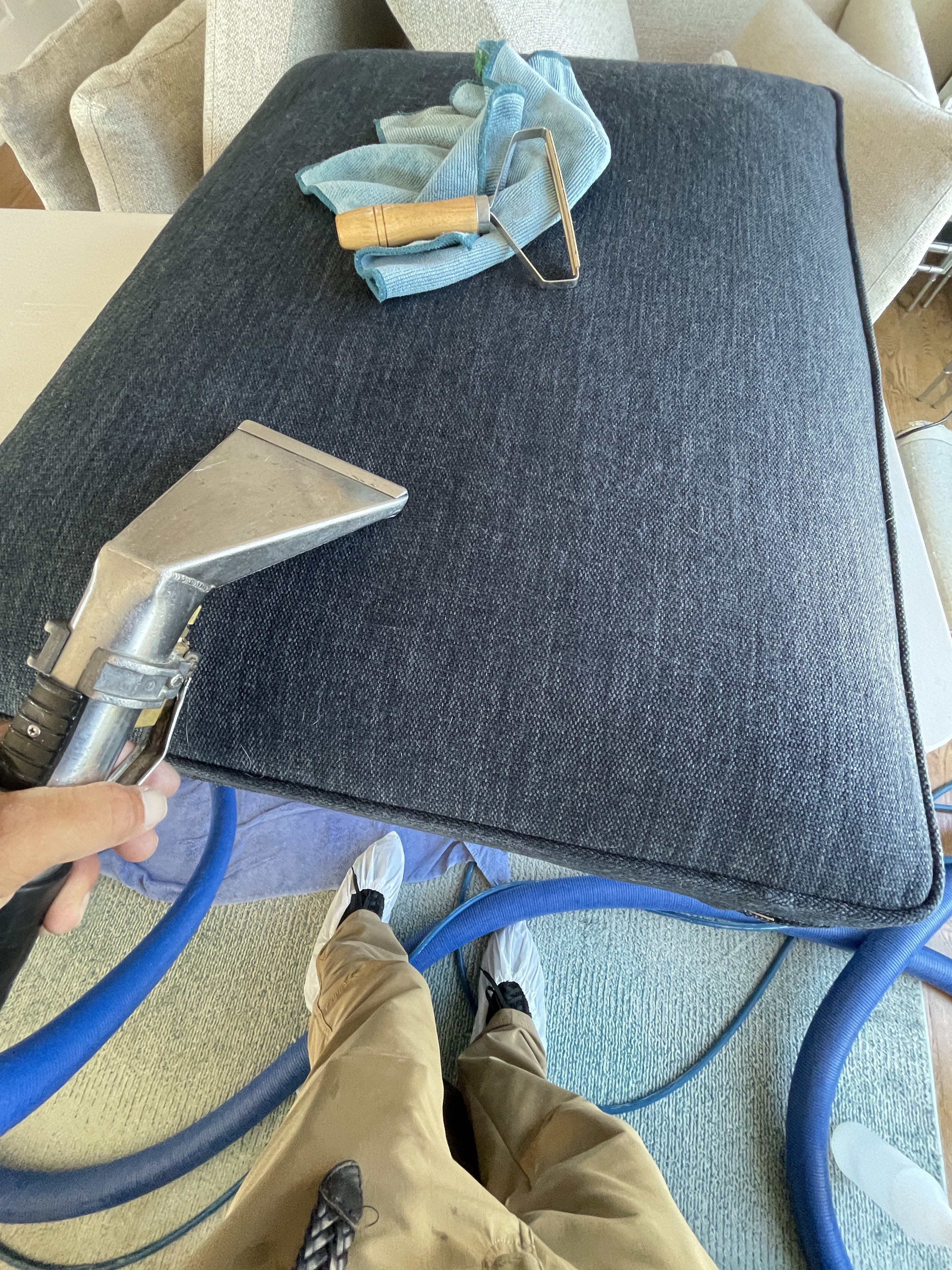 I like doing furniture. I carry a small picnic table with adjustable legs. A slow and steady pace suits meFirst job, sectional. Was 30 minutes into cleaning the 2 pieces with all the cushions off. I flipped the one, did my vac and cleaned. Next flipped the other piece. Vacuumed pretty hard, a lot of hair.